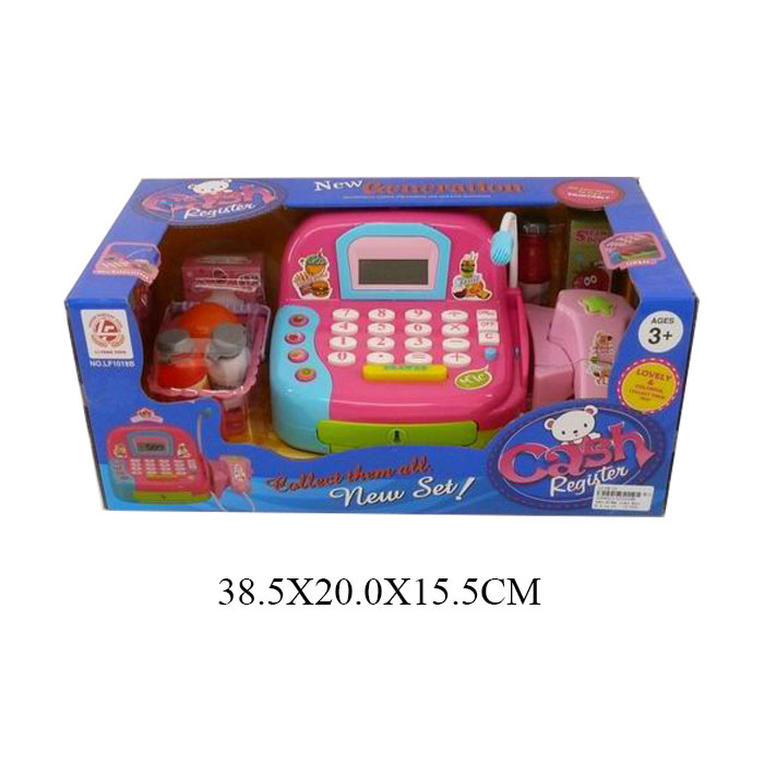 În set: aparat de casă cu un microfon și un calculator, un scaner, un coș, alimente, bani, un card bancar. Alimentat cu 3 baterii AA (1,5 V), care nu sunt incluse. Dimensiune ambalaj: 40x20x16 cm. Vârstă: 3+.