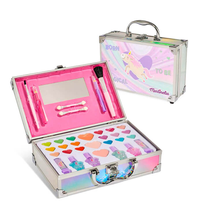 Martinelia Little Unicorn Perfect Traveler Glitter Case – o minunata caseta metalica cu detalii metalice argintii care include 18 farduri de pleoape, 4 lacuri de unghii solubile in apa, 3 bronzante si farduri de obraz, 2 rujuri de buze, 2 creioane pentru buze, 1 pensula pentru fard de obraz, 1 pensula pentru bronzant si 2 pensule pentru fard de pleoape.